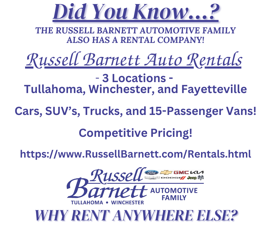We have rental vehicles! Cars, SUV’s, vans, and even trucks! Visit https://www.russellbarnett.com/rentals.html for more info!