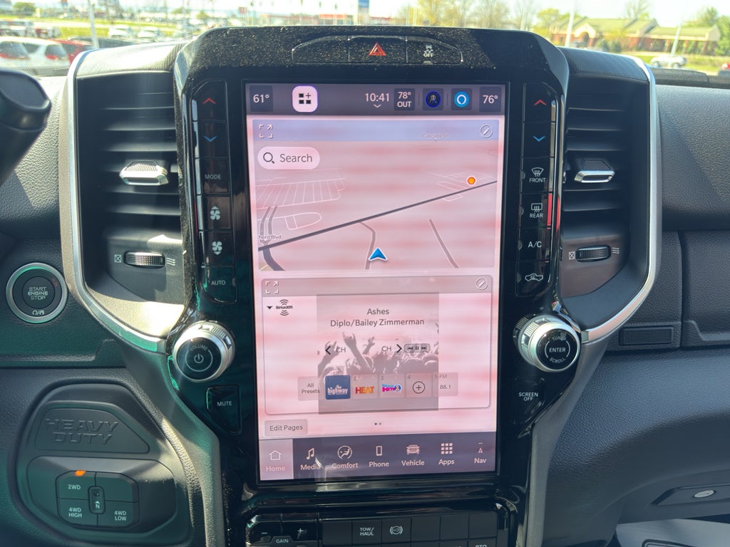 Quick Order Package 25Z Big Horn: Black-Out Tape; Manual Folding Exterior Mirrors; Tinted Acoustic Windshield Glass; Exterior Mirrors with Heating Element; Chrome Grille Surround; Trailer Brake Control; Painted I/P Bezels with Hydrographics; Mirror Running Lights; Black Exterior Mirrors; Premium Vinyl Door Trim with Map Pocket; RAM Door Badges; Power-Adjustable Convex Aux Mirrors; Cloth 40/20/40 Bench Seat; Mirror Power Heat Fold Telescope Black; Exterior Mirrors with Supplemental Signals; Body Insulation; Exterior Mirrors Courtesy Lamps; Passenger Sun Visor with Illuminated Mirror; Matte Black Mesh Grille with Chrome; Center Hub; Satin Chrome Key Fob; Acoustic Front Door Glass; Manuarl Telescoping Mirrors; Power Adjust Mirrors; Traveler/mini Trip Computer; Bright Front Bumper. Big Horn Level 2 Equipment Group: Google Android Auto; SiriusXM Radio Service; CHMSL Lamp with Camera; Rear Window Defroster; For Details. Visit DriveUconnect.com; For More Info. Call 800-643-2112; Rear Power Sliding Window; Rear Dome with On/off Switch Lamp; Integrated Voice Command with Bluetooth®; Connectivity - US/Canada; 12.0" Touchscreen Display; Glove Box Lamp; Courtesy Lamps; GPS Navigation; 4G LTE Wi-Fi Hot Spot; GPS Antenna Input; Temperature and Compass Gauge; SiriusXM with 360L; Global Telematics Box Module; Connected Travel and Traffic Services; Foam Bottle Insert (door Trim Panel); Alexa Built-In; Apple CarPlay; Off-Road Info Pages; Locking Lower Glove Box; Trailer Tow Pages; Remote Start System; 400W Inverter; 9 Alpine Speakers with Subwoofer; Disassociated Touchscreen Display; HD Radio; Uconnect 5 Navigation with 12.0" Display Radio; Steering Wheel Mounted Audio Controls; Air Conditioning ATC with Dual Zone Control; Dual Glove Boxes; 115V Auxiliary Power Outlet; Cluster 7.0" TFT Color Display; Universal Garage Door Opener; 19.5" X 6.0" Forged Aluminum Polished Wheels; Luxury Steering Wheel; Digital Rearview Mirror; Sun Visors with Illuminated Vanity Mirrors. 19.5" X 6.0" Forged Aluminum Polished Wheels. ParkView Rear Back Up Camera. Full Size Spare Tire. Manual DPF Regeneration. **Equipment listed is based on original vehicle build and subject to change. Please confirm the accuracy of the included equipment by calling the dealer prior to purchase.**